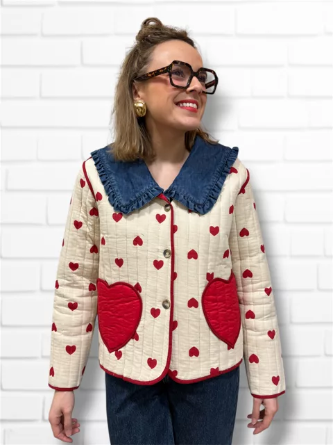 Veste matelassée col rond motifs coeurs avec poches en forme de coeur